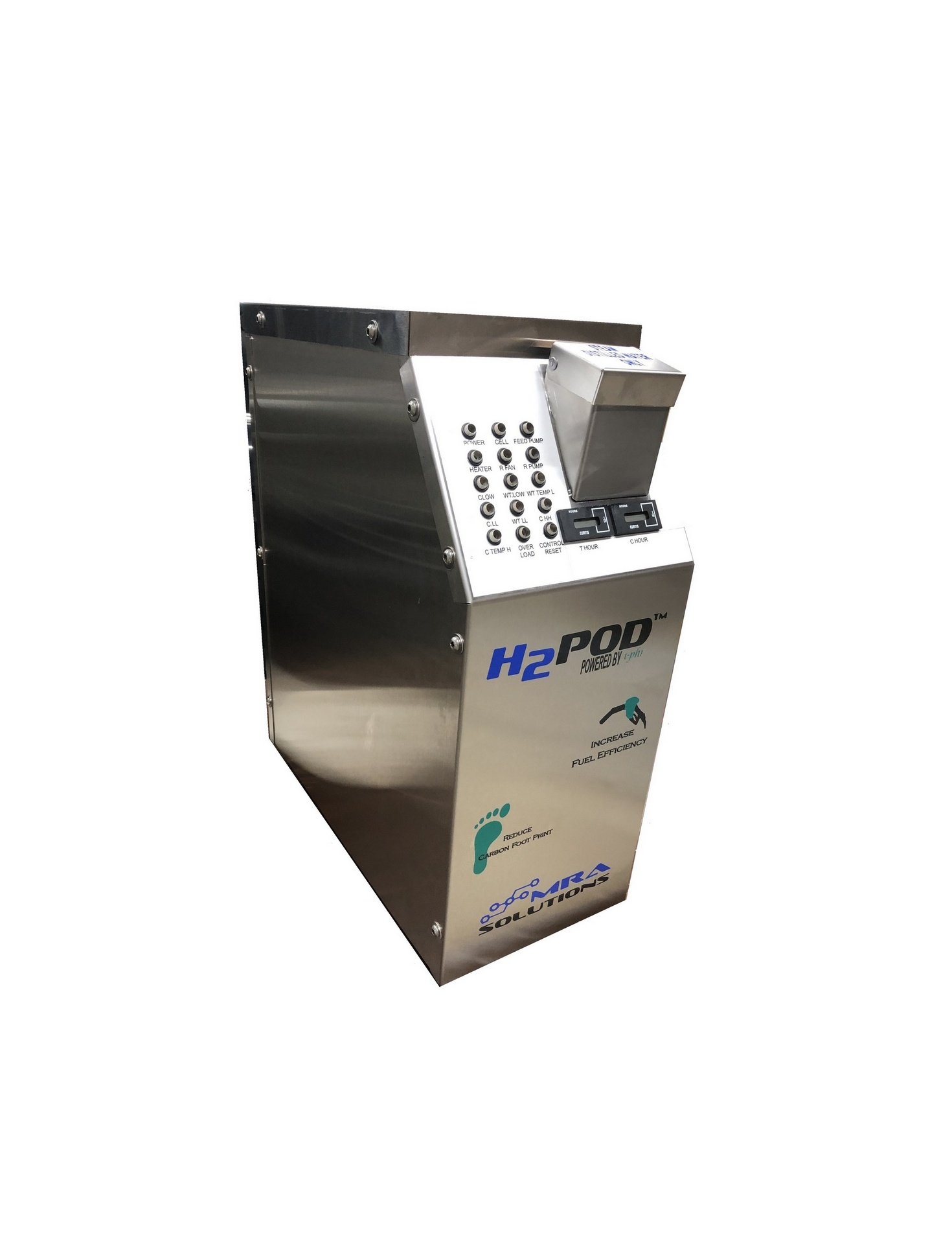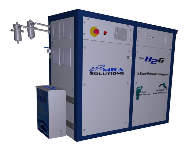 The H2POD™ powered by i-phi™ is a Hydrogen Generating System for internal combustion applications. The H2POD™ produces a mixture of hydrogen and oxygen gases, on demand, through a controlled electrolysis process. It is designed to work on any internal combustion engine. It operates on demand only when the engine is running thus eliminates the need for on-board Hydrogen storage and addresses all safety concerns